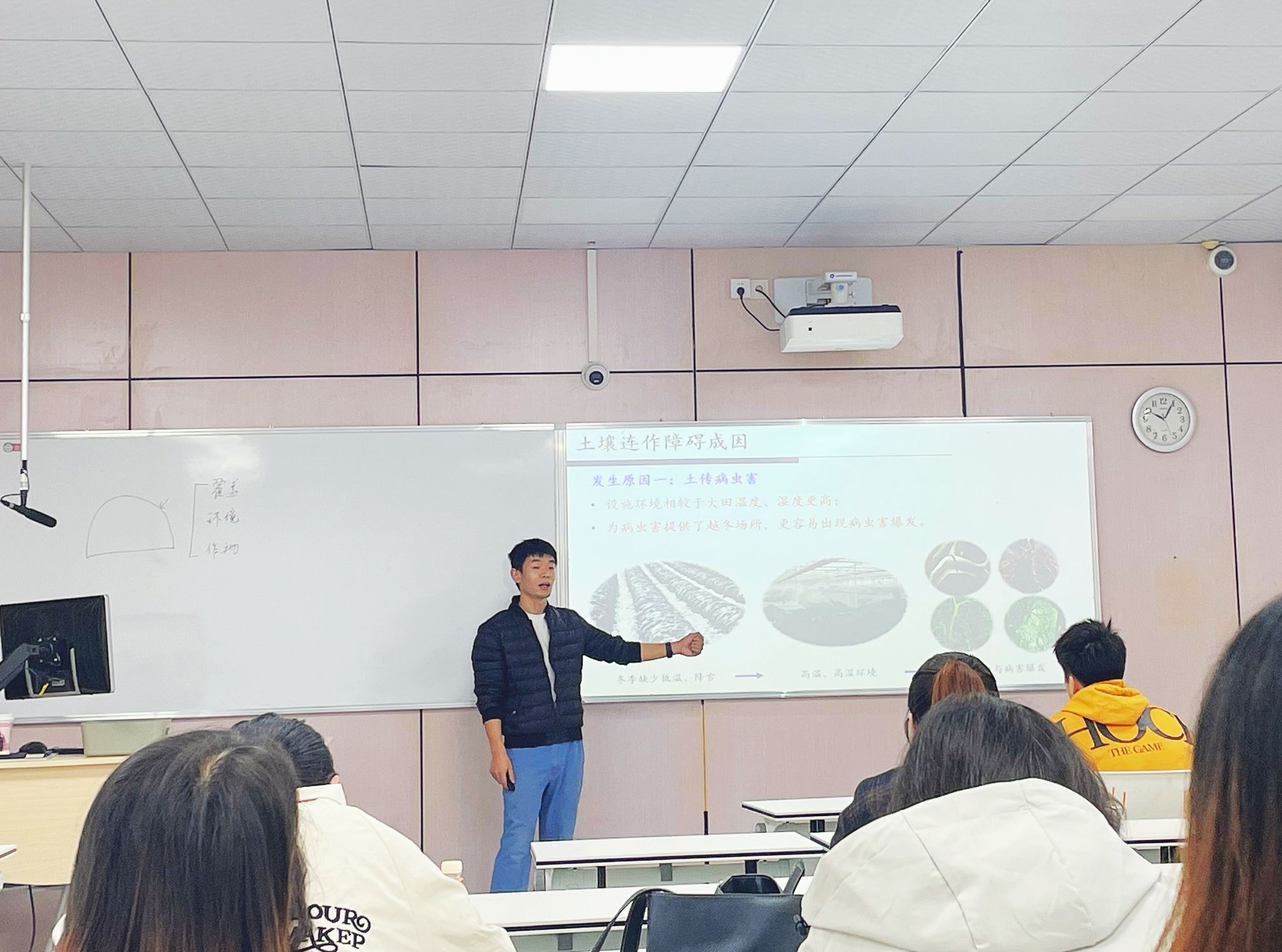 11月12日上午,闫国超副教授主讲了《设施园艺学A》的“设施环境特点与调控”章节。他以产业具体案例为引,层层剖析,将复杂的设施环境调控原理与技术要求讲解得深入浅出。